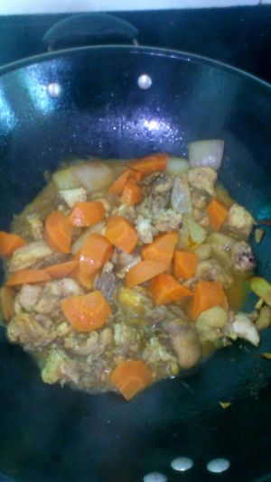 放进咖喱酱翻炒,然后放适量水。再把胡萝卜土豆放进去。