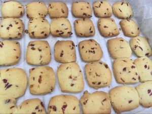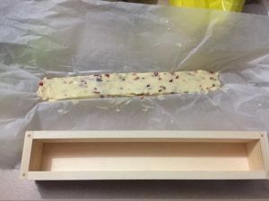 6.在饼干模上铺上油纸.放入做好的越蔓梅饼.压平.盖上油纸.放进冰箱冷藏2-3小时.