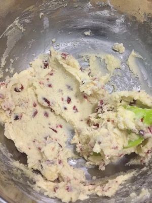 3.加入蛋液.倒入切碎的越蔓梅.再倒入过筛的低筋面粉.