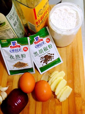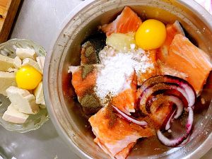 三文鱼骨首先放入少量盐,料酒,姜片搅拌均匀,去除腥味,放入适量孜然粉,黑胡椒粉,然后放入鸡蛋,淀粉搅拌均匀,腌制20分钟左右。