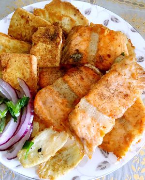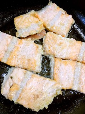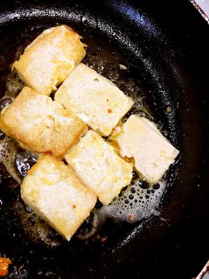 鱼骨也会出一些油,用余下的油煎豆腐块,煎熟煎透,颜色焦黄时出锅。出锅后再撒一些黑胡椒粉提味。(也可以制作一些椒盐)