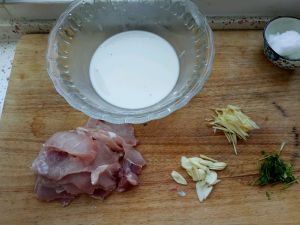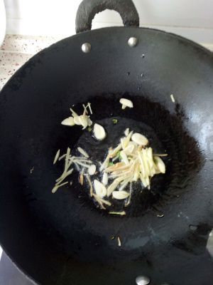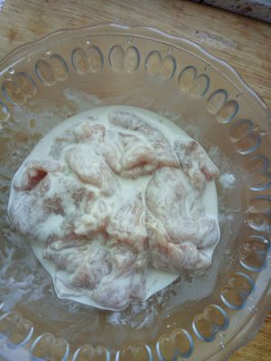 把肉切片,厚度在1-2毫米,姜切丝,蒜切片,淀粉加水调糊