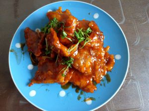当锅里的汁收治时,把肉倒进锅里翻炒,使每个肉片,都挂上酱汁,出锅时,撒点香菜,一道酸甜可口,外酥里嫩的锅包肉就做好了