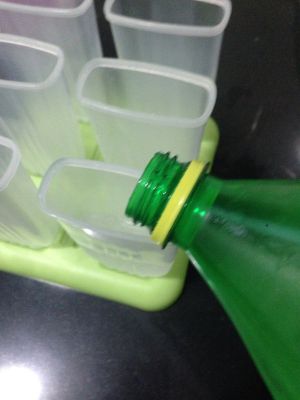 雪碧倒入模具8分满,千万不可太满,雪碧放入冰箱后还会产生气泡,倒太满了会溢出。