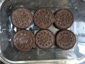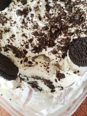 然后拿出两个奥利奥敲碎 洒在奶油上面 把迷你奥利奥放在放在上面做装饰 放入冰箱 冷藏2小时 就ok啦