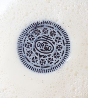 把奥利奥放进牛奶里泡一泡(广告语说的好 泡一泡 扭一扭 舔一舔) 然后拿出来 这里注意 不要泡太长时间