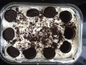 然后铺上一层奶油 上面再放上奥利奥