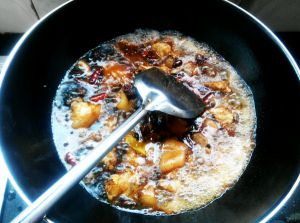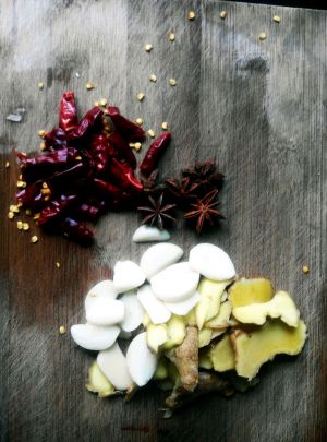 姜和蒜切片,热油下锅,先放这些辅料,翻炒两三秒就可以把猪蹄下锅(同时烧一小锅水,烧至沸腾)