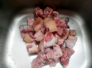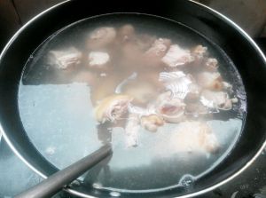 水开以后将猪蹄倒入,煮沸后捞起(因为有浮沫,我又用冷水冲了一下)