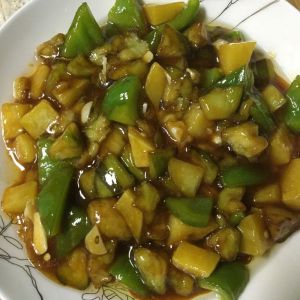 油锅烧热,土豆块,茄子块炸至八成熟。青椒在油锅里过一下就捞出来,否则不绿了。
