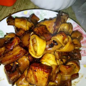 这是我上次做的红烧肉百叶结,也是最后快出锅前放百叶结。翻炒翻炒就行了。