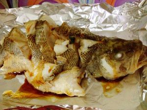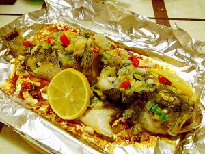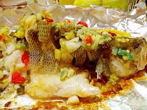 鲈鱼清理干净开花刀上滚水锅蒸6分钟,弃汁将鱼摆烤盘锡纸上。