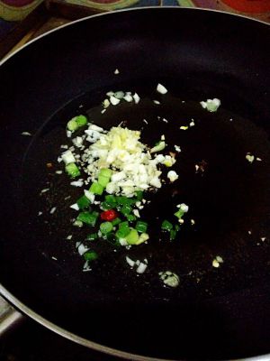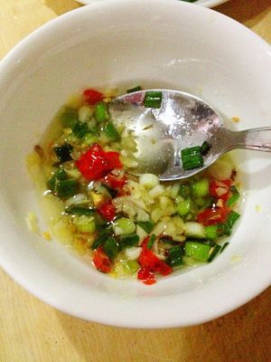 热油爆香的葱姜蒜倒入柠檬汁的碗内,加入少许盐拌匀。