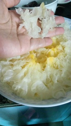 把银耳提前两个小时左右泡发,把头去了,掰成小片