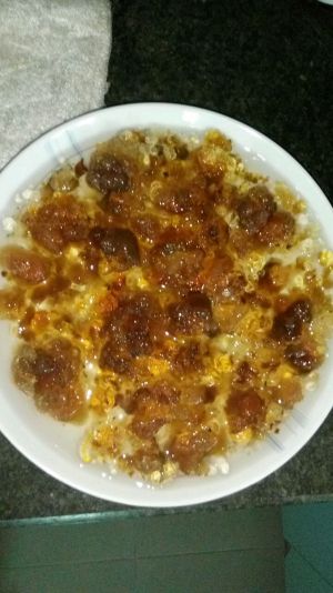 隔夜把桃胶泡发,一般泡发12个小时左右(这是一小把的发开量)