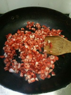 选八颗草莓切丁,下锅加小半碗水翻炒,直到水分全部蒸发,草莓丁变成草莓糊糊就好啦,和番茄酱做法一样的啦
