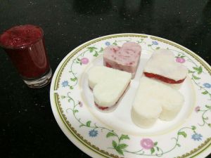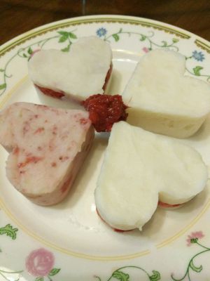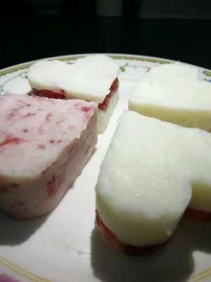 摆盘的时候可以多做几个花样,这是先压一层山药泥,再放一层草莓,最后再盖上一层山药泥的花样
