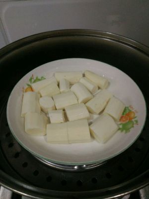锅里水烧热,山药切段放进锅里蒸二十分钟左右