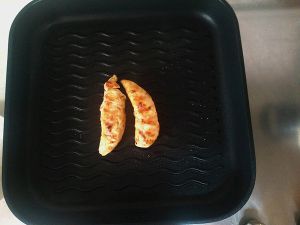 烤锅里放入少许的橄榄油,将腌制好的鸡柳放入预热好的烤锅里。