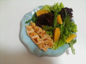盘子里放入沙律菜,放入香橙与鸡柳片。