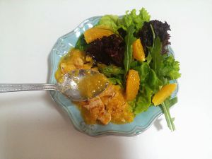 将拌好的香橙酱汁淋到鸡柳片与沙律菜上。