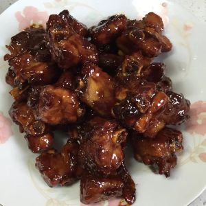 肉熟后观察下水量,一般水量到排骨一半的地方。看下肉的色泽是否够,不够可以再倒些老抽补色。然后放糖,一般我会放5勺糖,开始收汁,这时可转小火,熬到汁水粘稠,收汁时注意不要糊壁,出锅前加入适量的醋,即可出锅。切记不要烧过,否则会吐油。出锅后可以撒些葱花在上面点缀