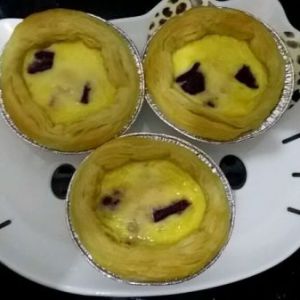 然后蛋挞皮放烤盘摆好,先放好蒸好紫薯丁,然后加上八分满的酱。放进烤箱……烤箱先预热5分钟,上下火210°,烤18分钟就好。