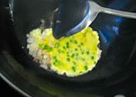 倒入蛋液,隔十秒后用勺的后背轻轻推开蛋液,令还未凝固的蛋液流到锅中央,待鸡蛋全部凝固后用勺将其切成小块