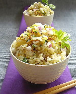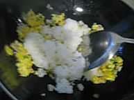 加入盛饭充分炒匀,用勺的背面将结成团的饭压碎,这一步很重要,因为谁也不想吃到结成块的未入味的炒饭。