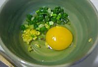鸡蛋里加入一半葱花,及姜碎,打散(事先将葱及姜加入鸡蛋一起打散是为了让葱和姜的汁液融合进蛋里,增添蛋的鲜味)