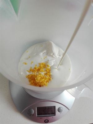 酸奶和柠檬皮放在搅拌杯中,放入淡奶油