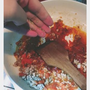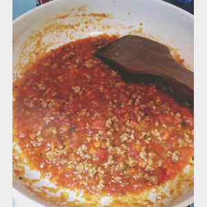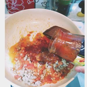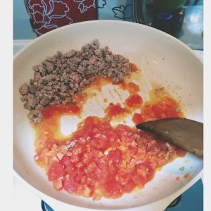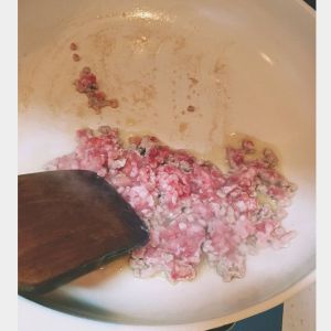 锅中倒入茶树油,最好用植物油,先将猪肉末炒熟。
