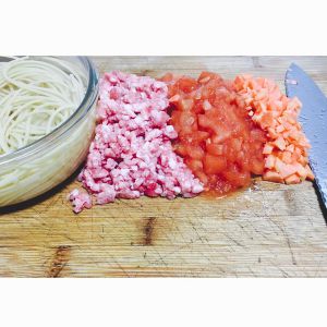 胡萝卜剁碎,一切食材准备好以后。我没有加洋葱,不喜欢吃,最主要的原因是,家里并没有