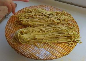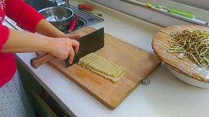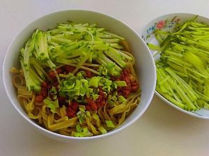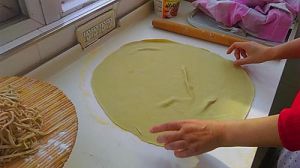 准备好黄瓜丝,并烧水,用擀面杖将面擀开,擀薄;
