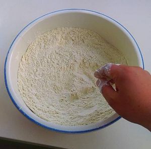将苦荞粉和面粉以1:4的比例,混合,搅匀;