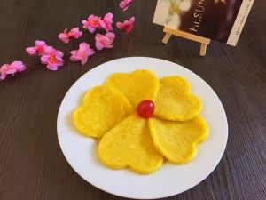 平底锅刷油,油热放入心形模具(模具要擦油更易脱模),将面糊倒入模具中,小火煎制表面金黄变硬