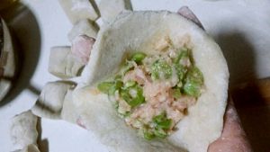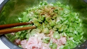 无筋豆(也可以换成其它自己喜欢的菜)切成小块,和所有调料,生姜沫一起加入肉馅中。搅拌均匀