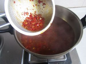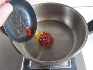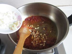 烧热锅,放适量的油,下入豆瓣酱煸炒;