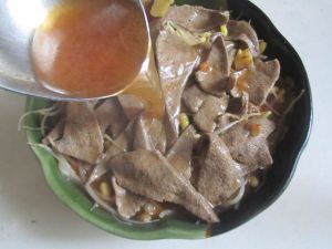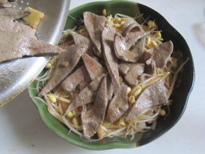 猪肝烫变色后捞出来平铺在豆芽菜的表面;