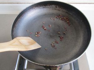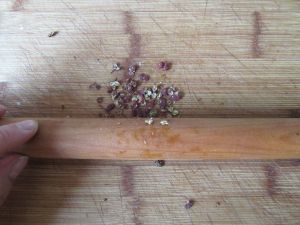 炒好的花椒粒放在案板上,用擀面杖碾成碎末;