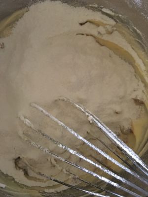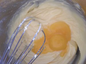 把鸡蛋加进打发好的黄油里,继续搅拌均匀