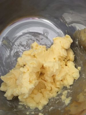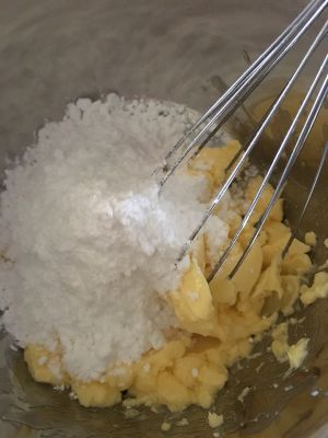 把糖粉加进黄油里,用打蛋器搅拌均匀,至黄油变得细腻