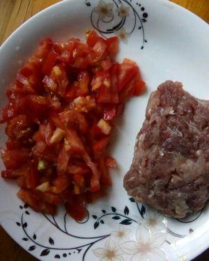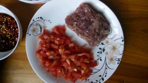 这步忘记拍照了,瘦肉下锅炒散,加入西红柿,放盐和水将肉煮熟,留些汤。