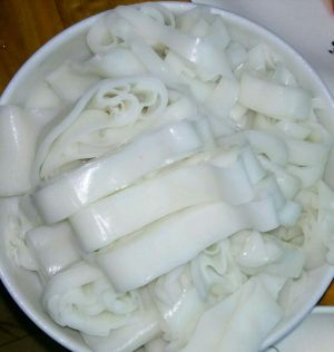 生米粉焯热水后马上放入凉水中,捞起,摆盘。