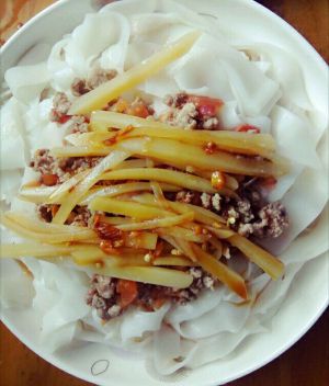将上一步的肉汤和酱淋在米粉上,我顺便加了些醋溜土豆丝,最后淋上第二步的酱就OK了,十分简单拌匀就可以开吃了。