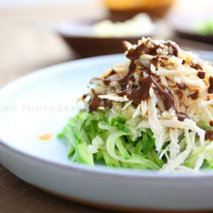 最后取盘子,将小黄瓜丝垫底,鸡丝堆于上方,撒上蒜泥和花生碎,淋上怪味汁,再滴上少许香油和适量辣油,撒上些白芝麻即可。