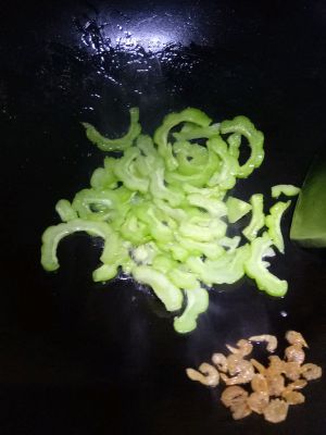 我贪懒,就没把虾米弄上来,就把虾米捞置一边,直接下苦瓜炒