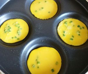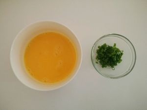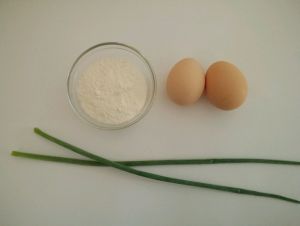 将面粉、盐加入到蛋液里,搅拌均匀后加入葱花拌匀。