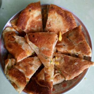 弄好这些,面粉发酵时间到,然后放到比较干净的切板上,把面粉推开,加入弄好的配料,上面也用面皮盖上,锅里放油,小中火开始炸,炸成金黄就可以了。