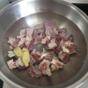 切几片生姜,冷水下锅焯水。